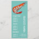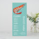 Un modèle de menu coloré et mignon pour un restaurant de fruits de mer moderne ou une soirée à thème de fruits de mer et de poisson. Ce menu mignon a une illustration originale adorable d'une crevette contre un fond personnalisable à thème de plage sarcelle aqua. Le texte peut être personnalisé pour répondre à vos besoins.