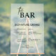 Le menu du bar à boissons moderne de marque mariage propose des boissons signées Bride and Groom ainsi qu'un choix de boissons supplémentaires.