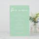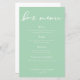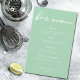 Le menu de ce bar à menthe vert mariage propose une typographie blanche chic pour une cérémonie de printemps. Écriture simple et élégante sur des menus paisibles et solides vert pastel pour une réception de jardin.