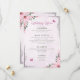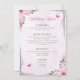 Description : Un menu de mariage magnifiquement conçu avec une bordure florale rose pastel agrémentée de papillons et de verdure. Le menu est divisé en sections : entrées (salade de jardin avec vinaigrette balsamique, soupe de tomates au basilic), plat principal (poulet grillé avec purée de pommes de terre à l'ail et légumes vapeur, saumon poêlé avec pilaf de riz et asperges, pâtes végétariennes avec sauce tomate fraîche et parmesan), desserts (gâteau de mariage à la vanille avec glaçage au beurre, brownies au chocolat, salade de fruits frais) et boissons (eau gazeuse, limonade, thé et café). La typographie élégante et la palette de couleurs douces créent une atmosphère romantique et accueillante.