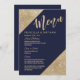 Cartes de menu de réception de mariage avec coins à paillettes de fausse brillance dorée imprimés élégants, chic et glamour et écriture dorée sur fond bleu marine. Ce design classique et sophistiqué est parfait pour une réception de mariage classe, élégante et tendance. Personnalisez avec votre propre menu sur le devant, ainsi que vos noms et dates. Puis personnalisez le dos avec votre initiale de monogramme. Conception d'impression photo personnalisée.