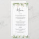 Menu de réception de mariage élégant avec un fond blanc élégant, feuillage d'eucalyptus aquarelle botanique, accents de paillettes dorées et un modèle de menu facile à personnaliser.