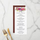 Menu de mariage floral aquarelle avec des fleurs violettes vives, bordeaux et rouges avec une touche d'or et de paillettes rose doré.