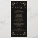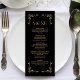 Le menu Mariage moderne décoré de noir et d'or ajoute une touche de luxe et de sophistication à votre réception, avec un fond noir audacieux agrémenté de détails Art Déco dorés et glamour. Idéal pour les couples accueillant un mariage d'inspiration formelle, chic ou vintage, ce menu guide non seulement les clients à travers l'expérience culinaire, mais améliore également le cadre de votre table avec un style intemporel. Son design élégant s'ajoute parfaitement aux célébrations à cravate noire et aux thèmes élégants, créant un regard cohérent sur votre papeterie mariage. Entièrement personnalisable avec vos cours et vos détails personnels, cette carte de menu sert de garde que les invités se souviendront bien après la célébration.