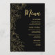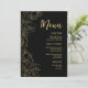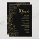 Carte du menu du dîner aux fleurs d'or noir. Design moderne élégant avec accents de dessin botanique et police de script de typographie. Carte de menu à plat branché 5x7 parfaite pour une célébration élégante.