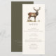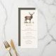 Carte de menu de dîner sur le thème de la chasse avec une illustration de cerf et une typographie élégante, dos vert olive foncé et texte personnalisé. Parfait pour un dîner champêtre, un dîner de répétition de mariage élégant, un dîner de chasse, une fête de retraite de chasseur ou une fête d'anniversaire de chasse.