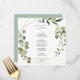 Cette carte de menu de calligraphie verte tropicale d'or géométrique est parfaite pour un mariage simple. Le design présente de beaux feuilles verts peints à la main, ornant un cadre géométrique doré. Ce menu peut être utilisé pour une réception de mariage, un dîner de répétition, une douche nuptiale ou tout événement.