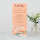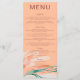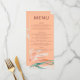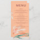 Elevez votre paysage de table mariage avec ce menu de dîner mariage moderne pêche. Doté d'éléments botaniques d'aquarelle abstraits dans des tons chauds et romantiques, ce design recto-verso présente votre repas soigneusement préparé sur le devant et un motif d'art élégant avec vos noms sur le dos. Parfait pour les mariages élégants, modernes ou d'inspiration boho.