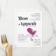 Ces dîners de style vintage 5" x 7" mariage menus de feuilles de papier menus en lettres noires avec un titre stylisé, "Bon Appetit", en grandes lettres noires avec un accent de coeur magenta sur un arrière - plan d'albâtre. Le menu propose 2 entrées, 2 entrées et 2 desserts ainsi que les noms des couples mariages.