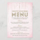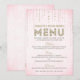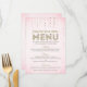 Cette charmante carte de menu conçue par The Spotted Olive™ présente un joli fond rose pâle avec une image de gemmes scintillantes descendant du haut et le mot "Menu" typographié de manière élégante avec une image de paillettes dorées à l'intérieur. NOTE IMPORTANTE : CE DESIGN NE COMPREND QU'UNE IMAGE IMPRIMÉE DE PAILLETTES ; IL N'Y A AUCUNE PAILLETTE PHYSIQUE UTILISÉE OU INCLUSE ; IL N'Y A AUCUN EMBELLISSEMENT.