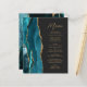 Le bord gauche de cet élégant menu mariage moderne présente une aquarelle bleue turquoise ornée d'une parties scintillant en faux or. Le texte personnalisable combine écriture manuscrite couleur or et polices sans serif sur un arrière - plan noir en ardoise foncée. Le design turquoise et or agate est répété à l'envers.