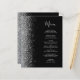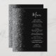 Le bord gauche de cet élégant menu mariage moderne présente une bordure de parties scintillant en faux argent. Le texte personnalisable combine écriture manuscrite gris argenté et polices cuivre sur un arrière - plan noir. L'envers présente un design noir et argent assorti.