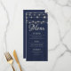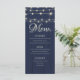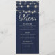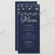 Présentant notre menu rustique mariage captivant avec des lampes à cordes scintillantes contre un arrière - plan à effet de bois foncé marine. Parfait pour cette fête à thème autour de la grange rustique. Personnaliser facile