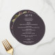 Une carte ronde pour le dîner sur un arrière - plan violet spectaculaire et des détails de menu en lettrage blanc chic avec de belles fleurs d'aquarelle rose et or sur le dos. Parfait pour une réception de mariage moderne, un dîner de répétition mariage, une fête d'anniversaire ou tout événement spécial avec un dîner assis. CORRESPONDRE des articles dans notre magasin.