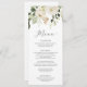 Elégant vert et blanc Floral Aquarelle Menu Mariage : Ce élégant menu à mariages fleuris présente en haut un bouquet unique de fleurs blanches et vertes. Le dos tient vos initiales dans un cadre verdoyant assorti. Vous pouvez ajouter du texte au verso en cliquant sur "customiser plus loin".