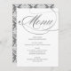 Les cartes de menu élégantes et formelles du mariage blanc comprennent un script de calligraphie gris-fusain foncé et un motif damassé au dos de la carte.