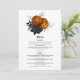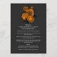 Ce design de menu magnifiquement élaboré allie orange et noir, parfait pour un mariage gothique au style chic et désuet. Les détails ornés et la palette de couleurs audacieuses donnent le ton d'une célébration romantique et sophistiquée. Idéal pour les couples qui souhaitent créer une expérience gastronomique inoubliable qui complète leur thème mariage unique.