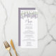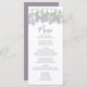 Ce design présente une carte de menu mariage avec un élégant script de calligraphie, avec un design floral classique de lavande lilas avec un cours de dîner classique