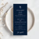 Add a refined and cohesive touch to your reception tables with this navy blue botanical wedding menu, designed to complement elegant and modern wedding themes. Featuring a deep navy background accented by a delicate white botanical sprig, this vertical menu card offers a clean and structured layout for listing your wedding meal courses in style. With distinct sections for starters, main courses, and desserts, this customizable menu is perfect for showcasing your personalized wedding dinner or buffet selections. The classic navy and white color palette coordinates beautifully with formal table settings, floral centerpieces, and matching wedding stationery from the same collection. Whether used at a seated dinner or plated reception, this botanical wedding menu enhances your guests' dining experience while adding a polished, design-forward element to your tablescape. Ideal for upscale weddings, city venues, or romantic garden receptions, it brings elegance and personalization to every place setting.