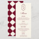 Wedding menu card featuring a hand drawn frame with your personalized information (monograms and meal courses) in elegant script and serif fonts on a cream background. On the back there is also a digitally hand drawn checkered background in matching burgundy and cream colors. You can find more matching products from this stunning wedding collection in our store.