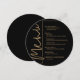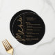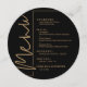 Une carte de menu de dîner noir et or ronde élégante présente vos choix de menu dans une écriture chic, parfaite pour une réception de mariage moderne, un dîner de répétition de mariage, une fête d'anniversaire ou tout événement spécial avec un dîner assis. Personnalisez facilement avec votre menu de dîner et vos détails. PLUS de couleurs dans notre boutique.