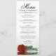 Ce beau menu ajoutera un peu de style à votre réception de mariage. Il présente un design magnifique et romantique avec un seul rose couleur rouille orange ou rouge brûlé sur son côté réfléchissant dans un bassin d'eau avec vagues et ondulations. Il y a de l'espace pour les noms du couple et la date du mariage, et le texte est entièrement personnalisable.