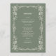 Elevate your reception tables with this elegant vintage Victorian-inspired wedding menu, featuring delicate botanical line art framing your meal selections on a sage green background. The ornate floral border adds timeless charm and sophistication, beautifully complementing garden weddings, classic soirées, rustic celebrations, and antique-inspired themes.