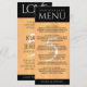 Ajoutez de la sophistication aux célébrations du 5e anniversaire du mariage de bois avec ce menu du dîner, qui comprend des lettrages élégants sur le faux, le grain de bois clair et les arrière - plans noirs. Customisez avec le nom du couple, la date du mariage, les détails du lieu, les menus et les messages de félicitations. Design © W.H. Sim. Voir plus sur zazzle.com/expressionsoccasions