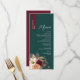 Ajoutez une élégance d'automne riche à votre paysage de table mariage avec ce menu mariage de bijoux personnalisé. Doté d'un arrière - plan vert émeraude profond et d'une spectaculaire bande bordeaux, ce design floral rustique présente des fleurs romantiques de couleur rouge, ivoire et vin aux herbes séchées, parfaites pour les fêtes d'automne ou d'hiver. Des polices élégantes et une disposition propre lui confèrent une atmosphère intemporelle et moderne. Customisez les détails du repas et le nom du client pour une alternative à la carte de place à votre réception.