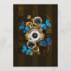 Composition de l'horloge ronde steampunk avec cadran romain noir, décoré avec des engrenages or et laiton, papillons Morpho bleu et lentilles endommagées sur arrière - plan rayé brun. Style Steampunk.