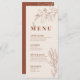 Ce menu est caractérisé par un style boho, des illustrations florales, des tons neutres terreux et beiges, avec un mélange de différents styles de police, souvent de différentes tailles, pour créer un look unique et éclectique qui donne à ces menus une esthétique naturelle.