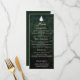 Une carte de menu rustique mariage avec une photo pittoresque de la forêt arrière - plan de Destei et une simple silhouette de sapin en haut pour une touche de bois. L'élégant titre du script dit "Menu" avec quatre sections ci-dessous idéal pour lister les entrées, les plats principaux, les desserts et les boissons. L’envers offre un arrière - plan vert avec la silhouette du sapin correspondant et une zone de texte personnalisable pour les noms du couple et la date du mariage. Un choix parfait pour des réceptions de mariage en plein air, en forêt, en randonnée ou dans la nature.