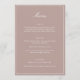 This formal wedding menu card features an elegant script heading, clean serif typography, and a classic border on a mauve background for a timeless reception look. The structured layout presents each course clearly while adding a refined, cohesive touch to table settings or place settings. Designed to coordinate seamlessly with classic and black-tie wedding stationery, it elevates the overall tablescape without feeling busy. Ideal for couples who want reception details that feel polished, organized, and enduring.