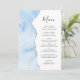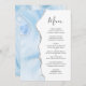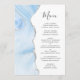 Le bord gauche de cet élégant menu mariage moderne comporte une bordure en aquarelle bleu bébé ornée d'une parties scintillant en faux argent. Le texte personnalisable combine écriture manuscrite et polices cuivre en gris charbon sur un arrière - plan blanc. L'envers est assorti d'un design d'agate bleu et argent bébé.