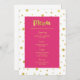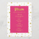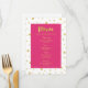 Menu mariage dîner en fuchsia rose et blanc avec motif de confetti d'or et texte de style lettré à la main, personnalisable avec vos détails et disponible en produits mariages correspondants.