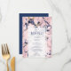 Ce menu mariage moderne et élégant est décoré d'un arrière - plan en marbre bleu marine, bleu et or. Le texte apparaît dans une police bleu marine sans serif simple et moderne sur un rectangle semi-transparent blanc aligné sur le bas de la carte. L'arrière du menu est bleu marine.