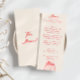 Un menu coloré rétro moderne et branché, rouge et crème pour le dîner mariage. Ce qui présente le design modèle chic de crémeux laiteux arrière - plan et de la typographie manuscrite rouge. Avec de la vaisselle tirée à la main sur le fond. Un Parfait et assorti à toute la suite.