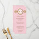 Carte de menu qui prend son influence de l'époque Art Déco. Un orchestre doré orné, ressemblant à une montre victorienne, présente un médaillon tenant le monogramme du couple. L'arrière - plan rose pâle imprime un motif subtil comme filigrane. Ajoutez ou réduisez l'espace entre le premier et le dernier initiales pour équilibrer avec le monogramme central. Ajoutez un menu customisé en dessous. Un look classique qui donne l'ambiance à n'importe quel mariage. Disponible en couleurs alternatives avec des produits correspondants.