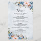 Menu botanique floral bleu Dusty mariage avec d'élégants bouquets de marine / bleu Dusty, blanc, blush, rose pêche et feuilles d'eucalyptus vert sauge. Veuillez me contacter pour toute aide sur la personnalisation ou si vous avez besoin d'un autre produit avec ce design.