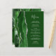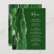Le bord gauche de cet élégant menu mariage moderne comporte une bordure en aquarelle vert chasseur ornée d'une parties scintillant en faux argent. Le texte personnalisable combine écriture manuscrite et polices de caractères en gris argenté sur un arrière - plan vert. L'envers présente un design d'agate vert et argenté assorti.