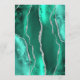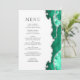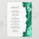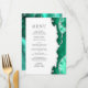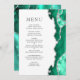 Le bord droit de cet élégant menu mariage moderne comprend une bordure d'aquarelle vert de mer ornée d'une parties scintillant en faux argent. Le texte personnalisable combine des polices de serif romaine gris fusain et des polices de cuivre sur un arrière - plan blanc. L'envers présente un design d'agate de mer et d'argent assorti.