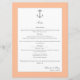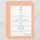 Ajoutez une touche de sophistication balnéaire à votre célébration avec ce menu Peach Simple Nautical Ancres Mariage, avec un motif d'ancrage classique et un design côtier élégant. Parfait pour les réceptions sur le thème de la plage ou maritime, ce menu présente vos options de dîner de réception dans un agencement simple et propre. Élégant script et typographie moderne mettent en valeur chaque cours en complétant le style général de votre thème mariage côtier. Un détail élégant qui améliore le cadre de votre table et guide les clients à travers votre expérience culinaire soigneusement organisée.