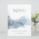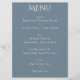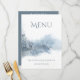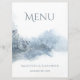 Menu Mariage Aquarelle bleu et blanc doux conçu avec une scène d'hiver en bleu et blanc. Le texte du côté avant comprend : les Noms de la Mariée et de la Chambre et la Date du Mariage. Le texte inverse comprend : vos sélections de menu complet de l'apéritif au dessert. Pour personnaliser ce menu, il vous suffit d'insérer vos détails dans notre modèle facile en remplaçant l'exemple de texte.