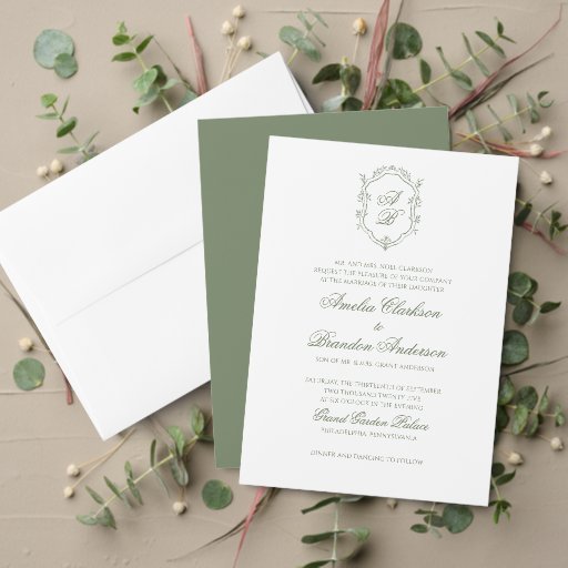 Deep Sage Green Botanical Monogram Crest WeddingConçu par Jessica Senarlo
