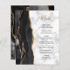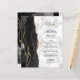 Le bord gauche de cet élégant menu mariage moderne comporte une bordure en aquarelle noire ornée d'une parties scintillant en faux or. Le texte personnalisable combine écriture manuscrite noir et or et polices de cuivre sur un arrière - plan en marbre gris et blanc. L'envers est assorti d'un design d'agate noir et or.