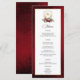Un service de massage en chambre, une literie hypoallergénique et un service de réveil par téléphone sont disponibles sur demande. Ce modèle formel personnalisé comprend des champs de texte modifiables pour vos choix de menu, des graphiques de texte de calligraphie personnalisés et une bordure en or texturée. La bordure extérieure et l'arrière présentent un arrière - plan opulent de velours rouge rubis.
