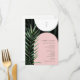 Arches blanches et roses sur arrière - plan en feuilles de palmier foncé. Monogramme vertical au-dessus de l'arc blanc. Texte gris sur arche rose avec feuille de palmier aquarelle à gauche.