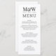 Menu Mariage Monogramme noir blanc. Bel design noir et blanc avec typographie moderne et initiales de couple en texte noir classique sur le front blanc avec blanc. Personnalisez avec les initiales de la mariée et du marié, la date du mariage, le menu du mariage et ajustez l'exemple de texte et/ou les couleurs de l'invitation à votre guise. Visitez notre magasin Austen & Grace pour voir la suite mariage complète, les produits correspondants et plus encore, et contactez-nous si vous avez besoin d'aide contact@austenandgrace.com
