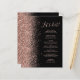 Le bord gauche de cet élégant menu mariage moderne présente une bordure rose en faux parties scintillant or. Le titre et le texte personnalisables combinent le script d'écriture manuscrite rose rose et les polices de caractères sur un arrière - plan noir. L'envers présente une parties scintillant en or noir et rose assortie.