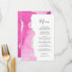 Le bord gauche de cet élégant menu mariage moderne comporte une bordure d'aquarelle rose ornée d'un faux papier argenté. Le texte personnalisable combine écriture manuscrite et polices cuivre en gris charbon sur un arrière - plan blanc. L'envers est assorti d'un design d'agate rose et argent.